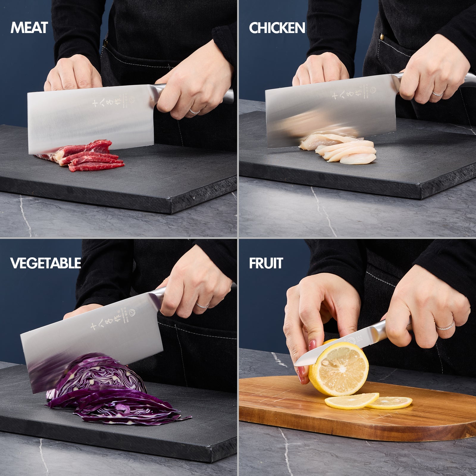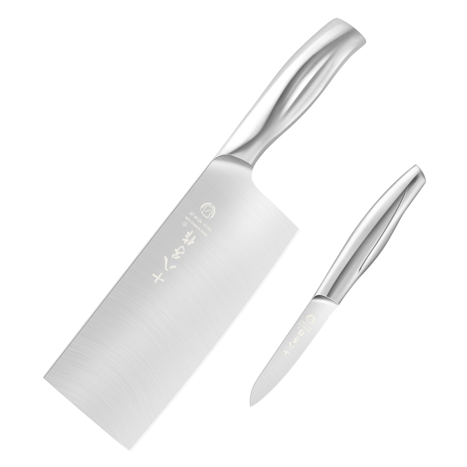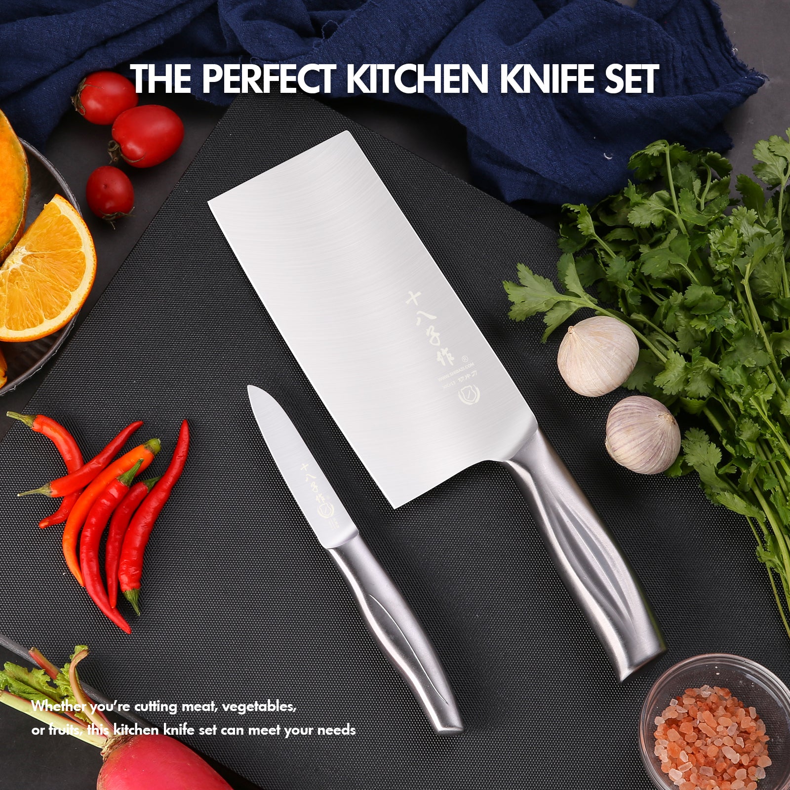 - 【Multifunctional knife set】This kitchen knife set includes 2 razor-sharp knives: a cleaver knife and a fruit knife.Whether you're slicing meat,vegetables,dicing herbs,or prepping fruits, each kitchen knife of this set is designed to handle a variety of tasks effortlessly. Perfect for both professional chefs and home cooking enthusiasts.