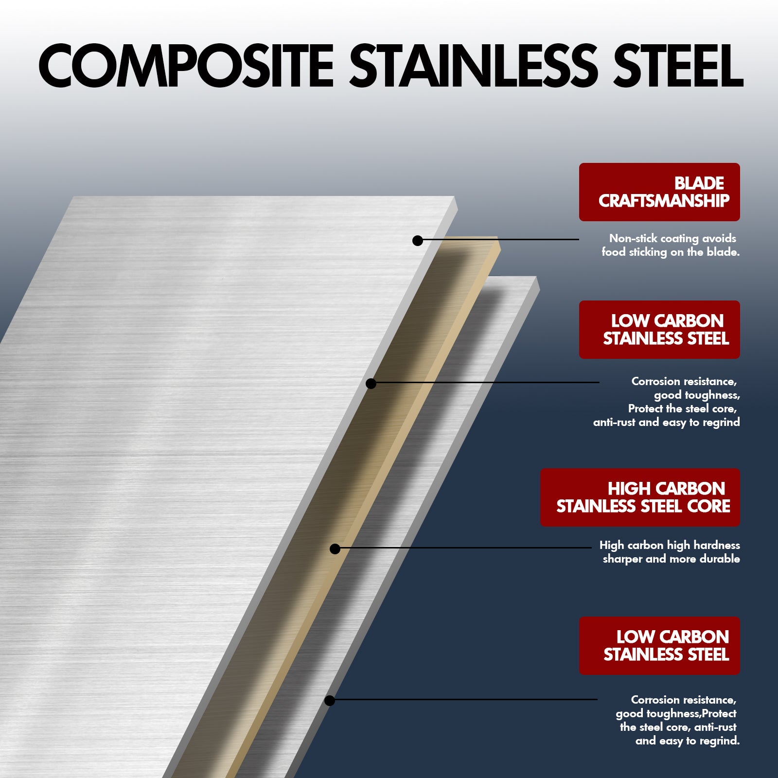 - 【Premium Stainless steel】3 layer high quality clad 40Cr13 stainless steel of high carbon core steel performs excellent hardness, durability and sharpness maintaining. Outside layers of low carbon steel does well in toughness, corrosion resistance and plasticity. The combination of two steels makes this Knife perfectly work.