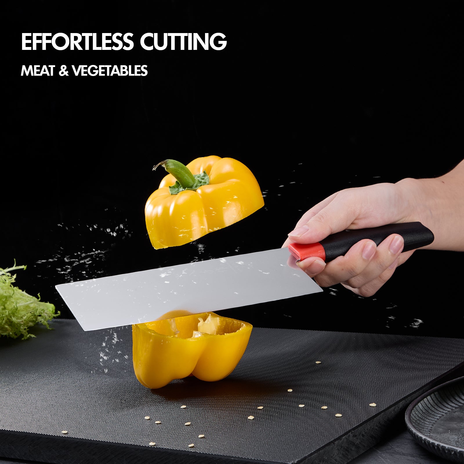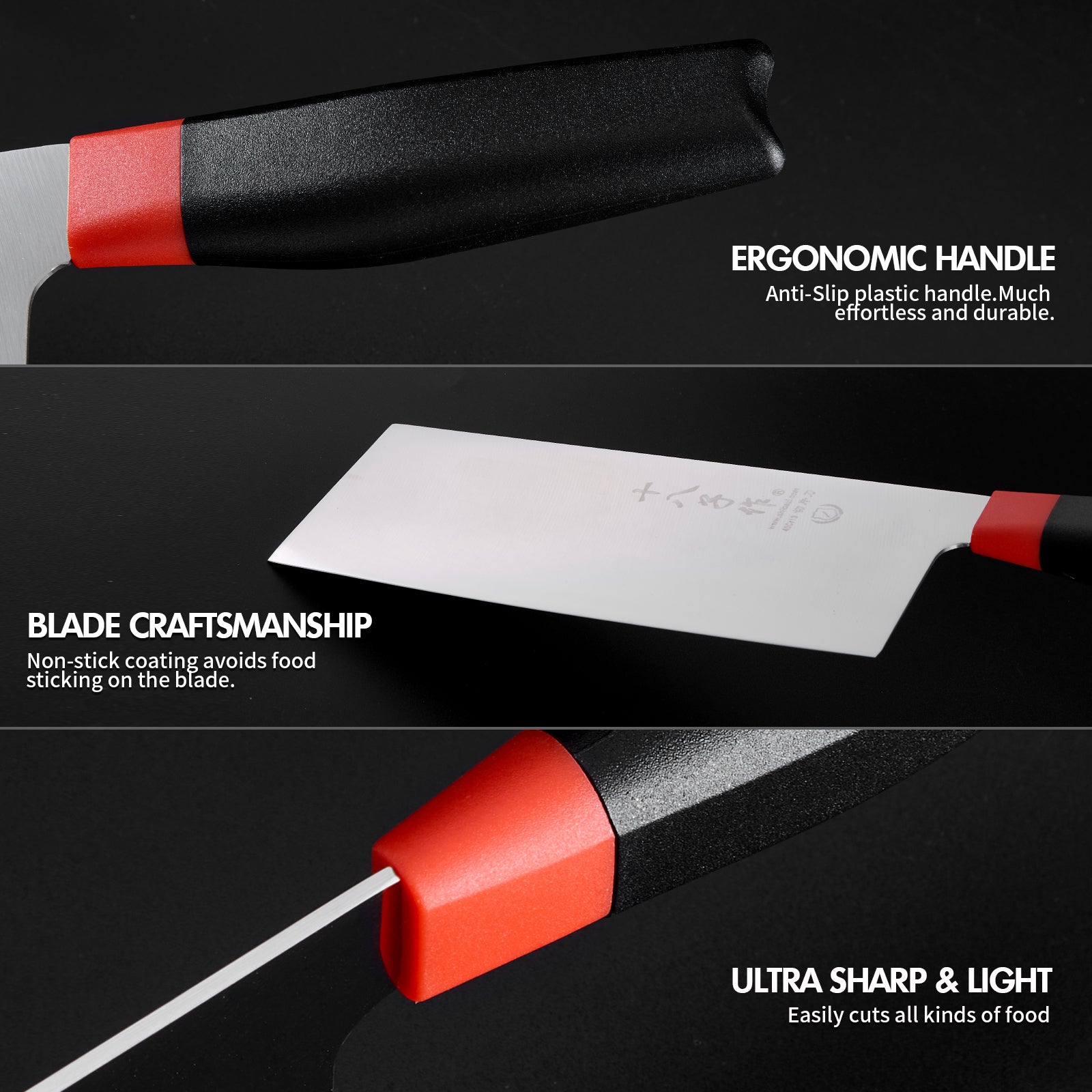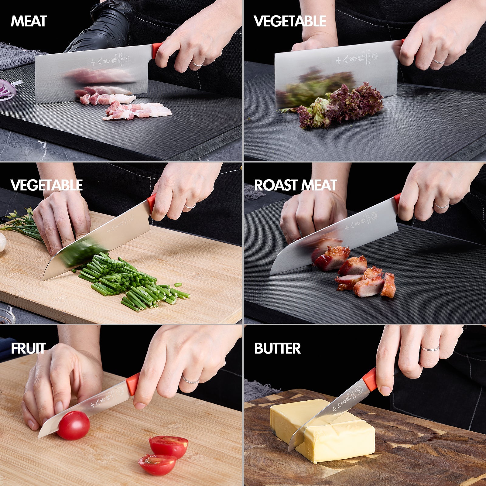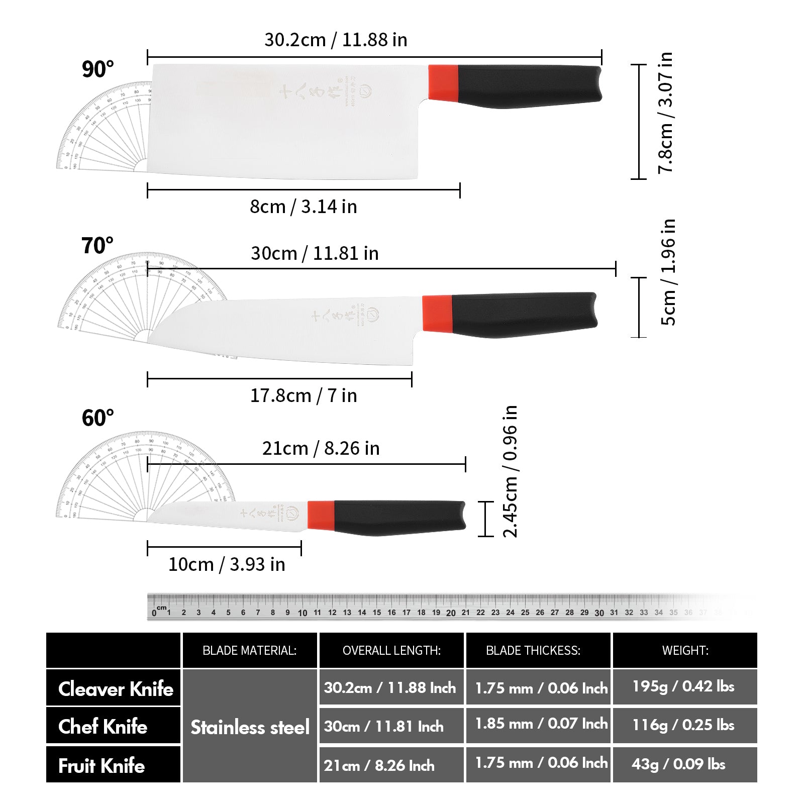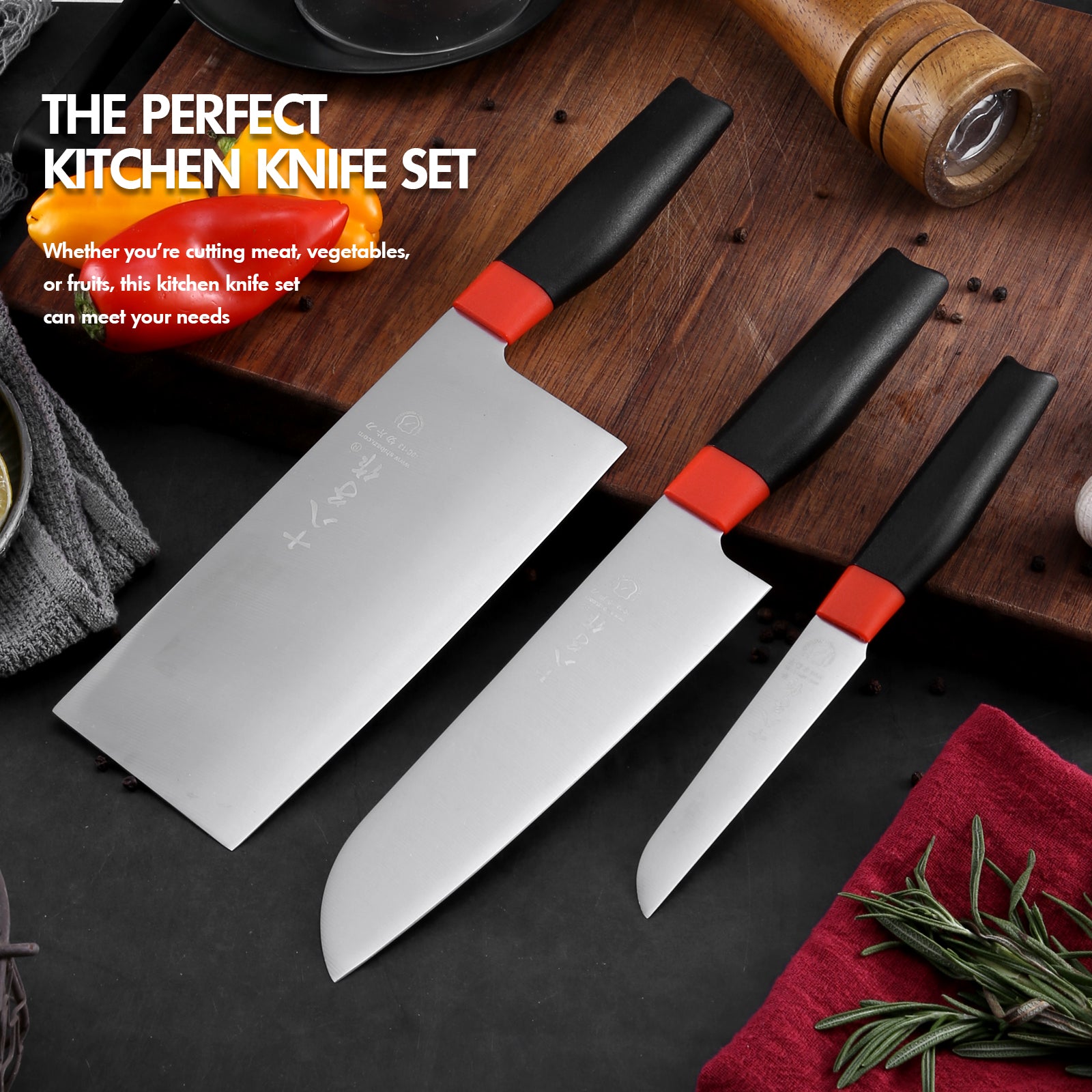 - Professional Knife Set - This kitchen knife set includes 3 razor-sharp knives: a cleaver knife, a santoku knife and a fruit knife.Whether you're slicing meat,vegetables,dicing herbs,or prepping fruits, each kitchen knife of this set is designed to handle a variety of tasks effortlessly. Perfect for both professional chefs and home cooking enthusiasts.