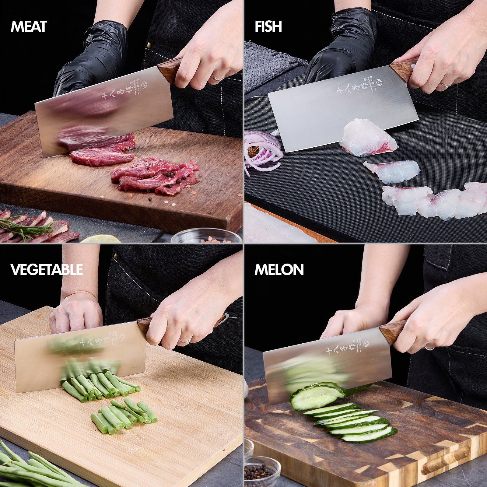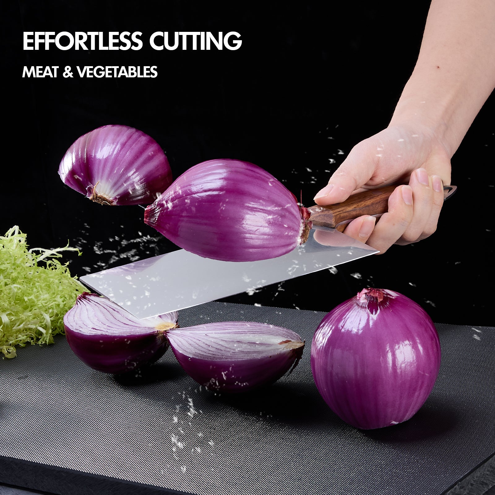 - Full Purpose Cleaver - Ultra sharp blade edge design and well balance of this knife make it perfectly for cutting, slicing, dicing and mincing meat, vegetable. Wide blade is able to smash garlic. It is suitable for homes and restaurants.