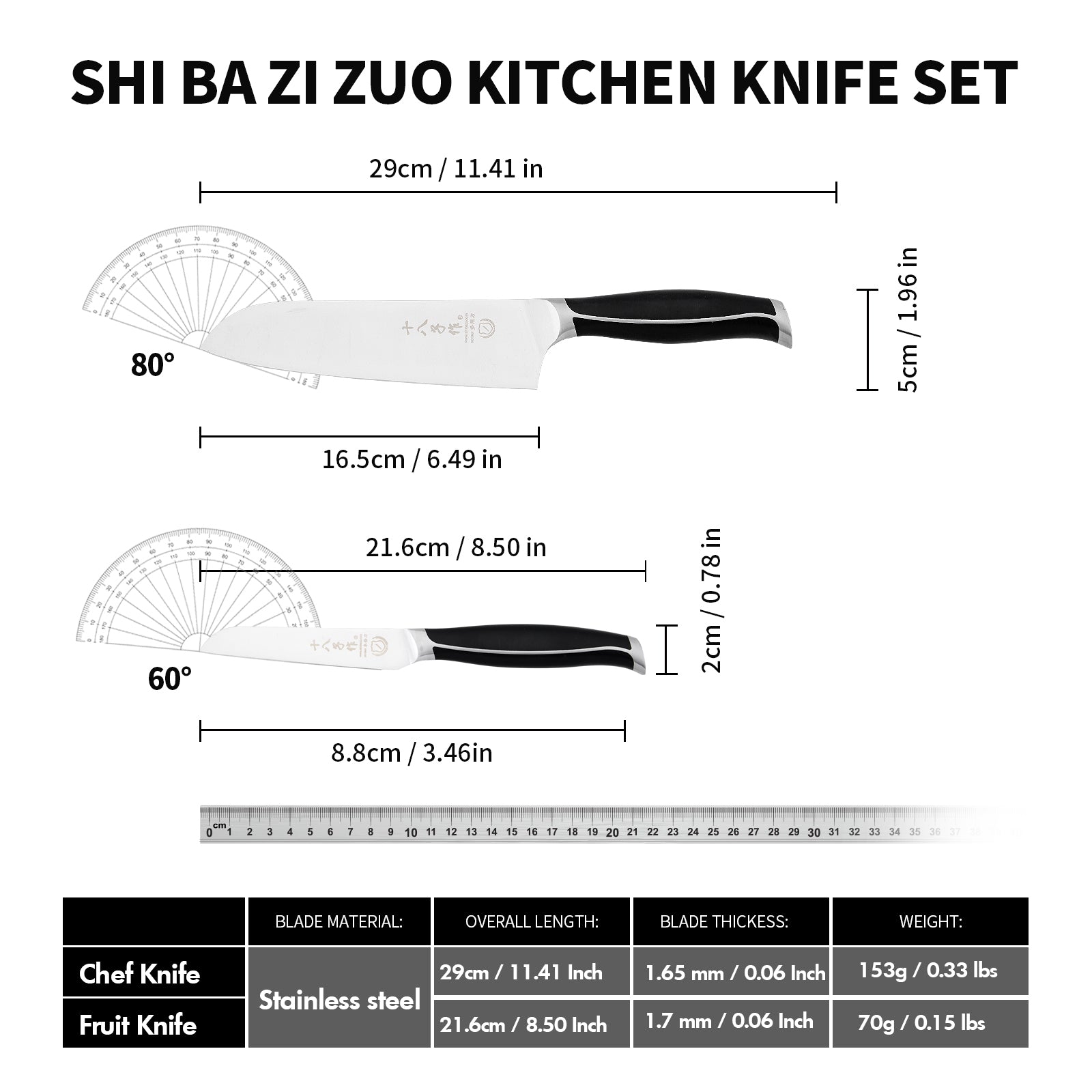 SHI BA ZI ZUO Kitchen Knife Set, 2 Piece Stainless Steel Professional Chef Knife Set Chef Knife Fruit Knife with Anti-Slip Stanless Steel Handle