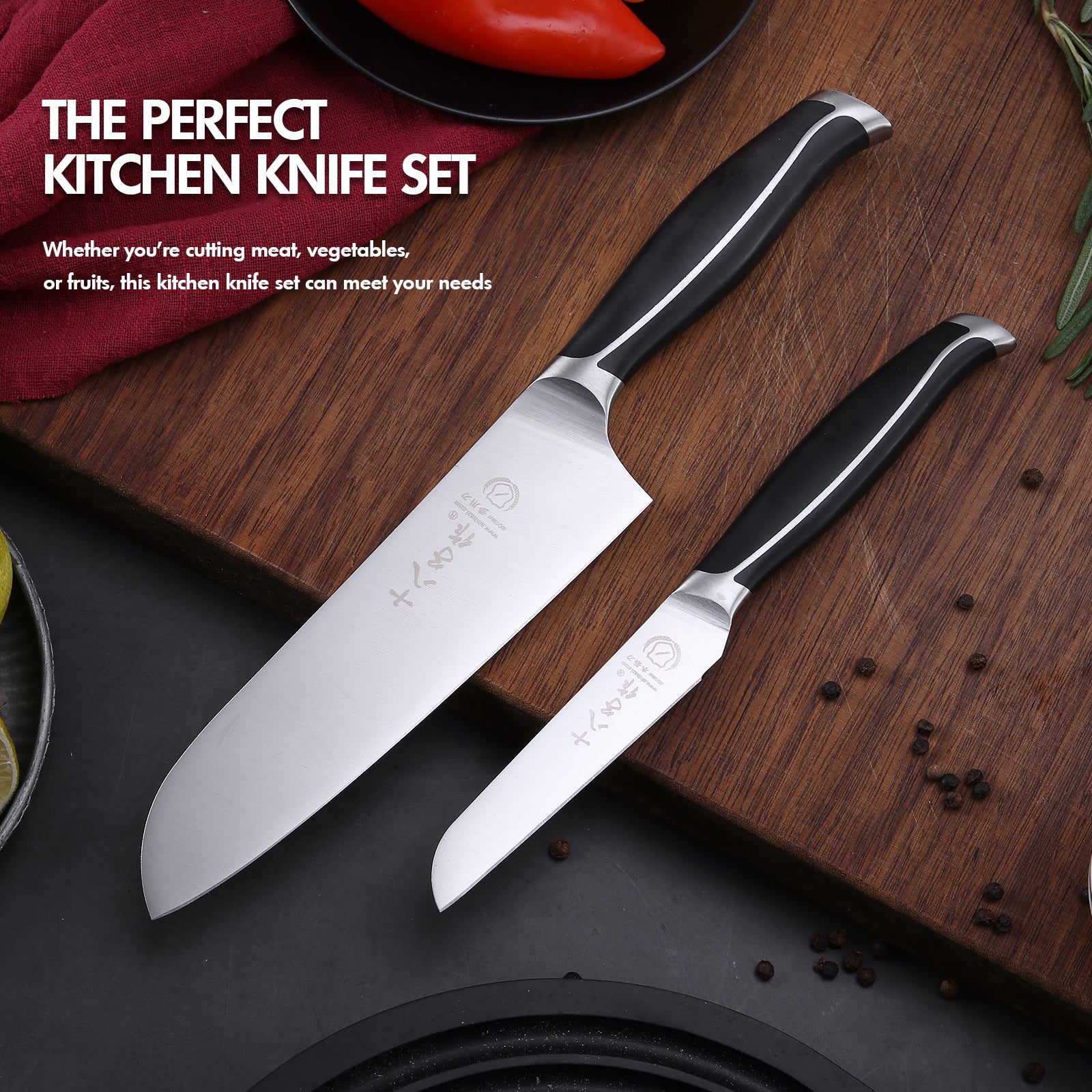 - Professional Knife Set - This kitchen knife set includes 2 razor-sharp knives: a chef knife and a fruit knife.Whether you're slicing meat,vegetables,dicing herbs,or prepping fruits, each kitchen knife of this set is designed to handle a variety of tasks effortlessly. Perfect for both professional chefs and home cooking enthusiasts.