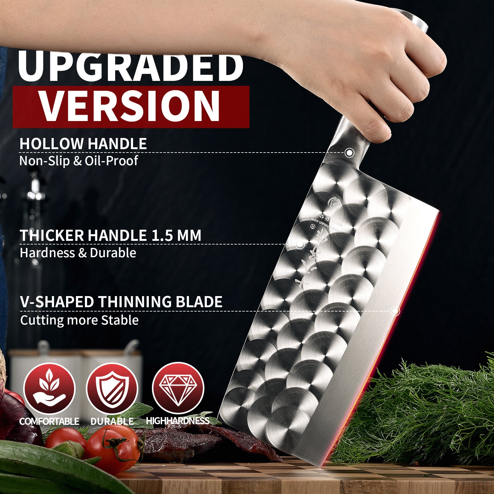 - Ergonomic Handle - Ergonomically designed stainless steel handle is anti-slip and anti-freezing and firm to grip avoiding harms to your hand while using the meat cleaver.