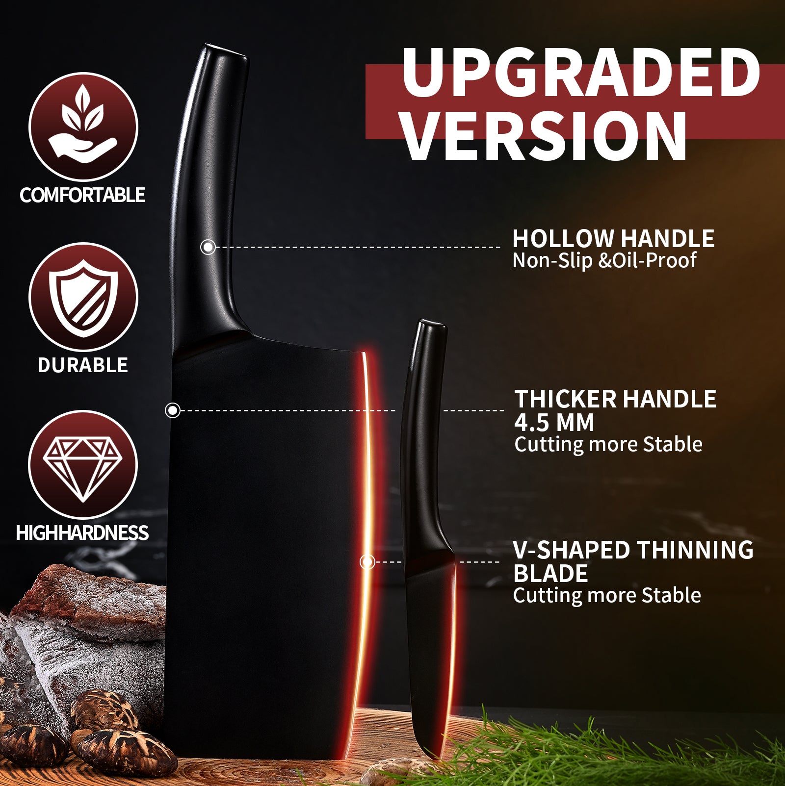 SHI BA ZI ZUO Meat Cleaver and Fruit Knife,2 Pieces Kitchen Knife Set,Black Ti Coating Cleaver Knife Slicing Knife Paring Knife with Hollow Handle