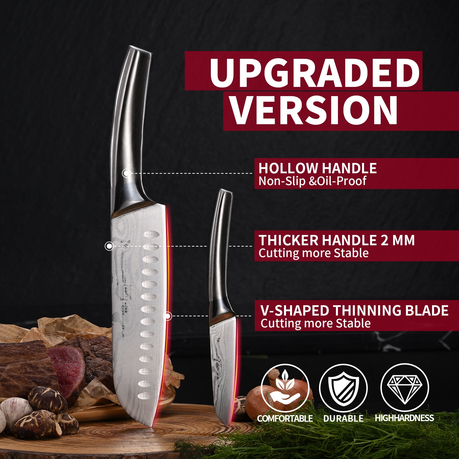 SHI BA ZI ZUO Santoku Knife and Fruit Knife Damascus Pattern Kitchen Knife Set Stainless Steel Japanese Chef Knife Paring Knife with Hollow Handle