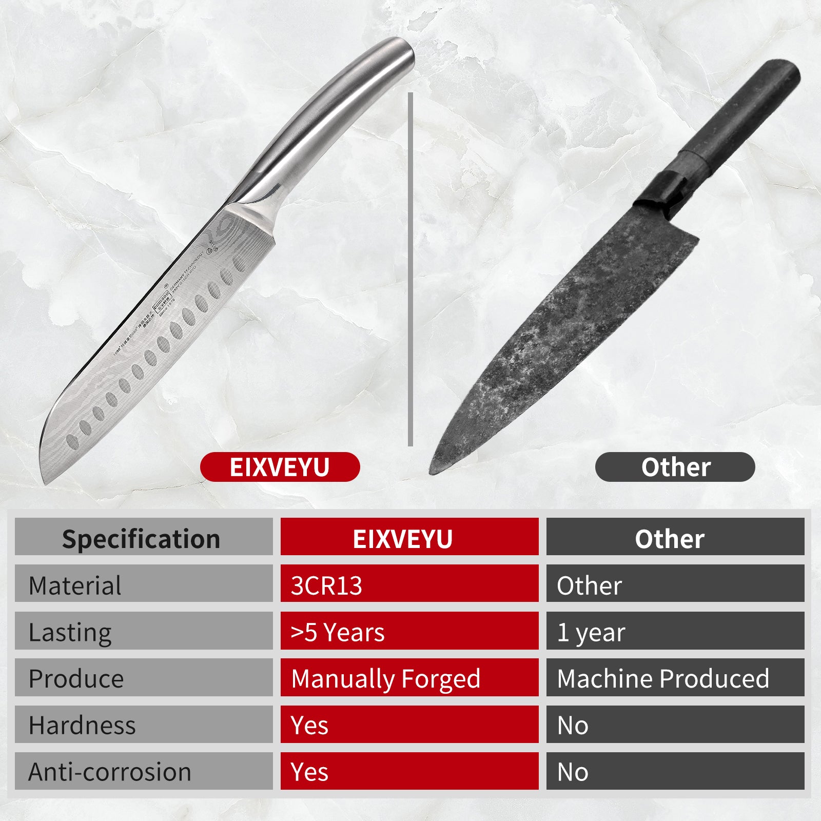 - 【Professional Knife Set】This kitchen knife set includes 2 razor-sharp knives: a 7 inches Santoku knife, a 5 inches fruit knife.Whether you're slicing meat,vegetables,dicing herbs,or prepping fruits, each kitchen knife of this set is designed to handle a variety of tasks effortlessly. Perfect for both professional chefs and home cooking enthusiasts.